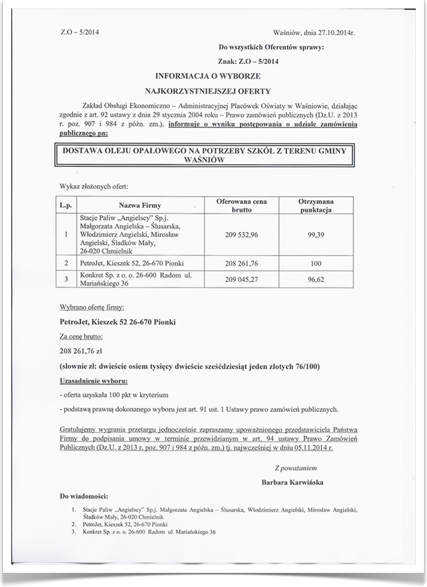 Informacja o wyborze najkorzystniejszej oferty - Aktualności - Centrum Usług Wspólnych w Waśniowie