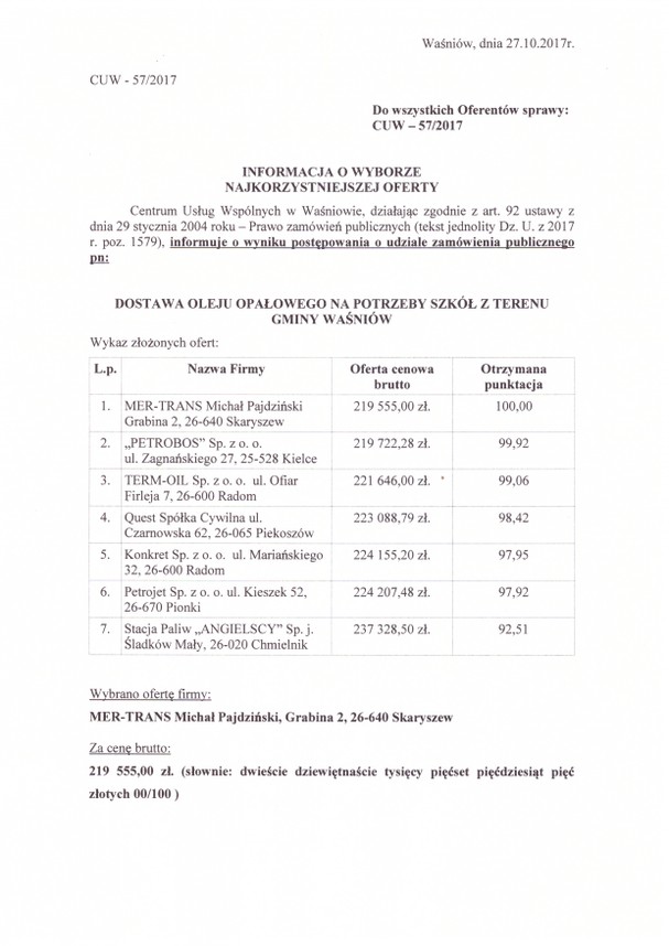 Centrum Usług Wspólnych w Waśniowie, działając zgodnie z art. 92 ustawy z dnia 29 stycznia 2004 roku – Prawo zamówień publicznych (tekst jednolity Dz. U. z 2017 r. poz. 1579), informuje o wyniku postępowania o udziale zamówienia publicznego pn: