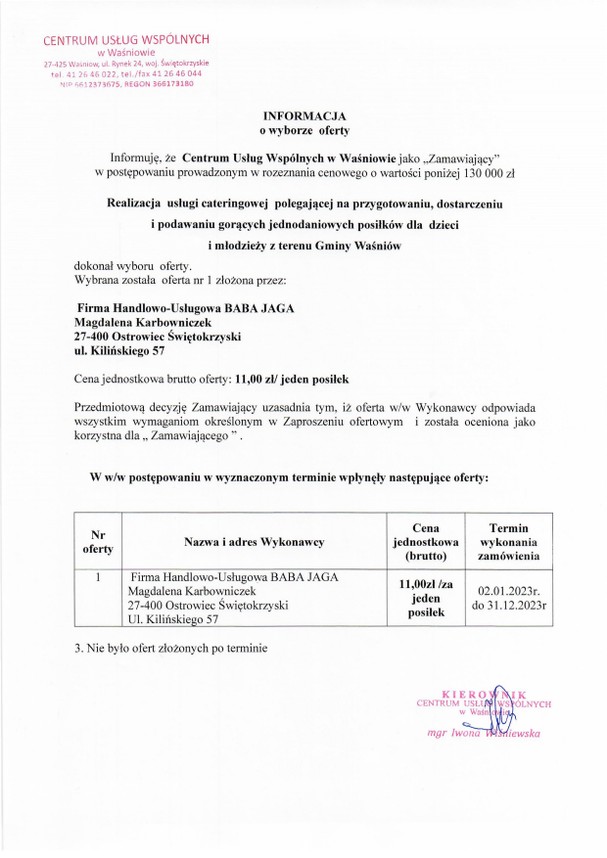 Przygotowanie, dostarczenie i podawanie gorących jednodaniowych posiłków dla dzieci z terenu Gminy Waśniów w roku 2023 - Informacja o zwycięzcy