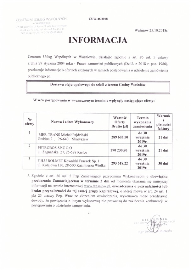 Informacja z otwarcia ofert dot. Dostawy oleju opałowego do szkół z terenu Gminy Waśniów - Aktualności - Centrum Usług Wspólnych w Waśniowie