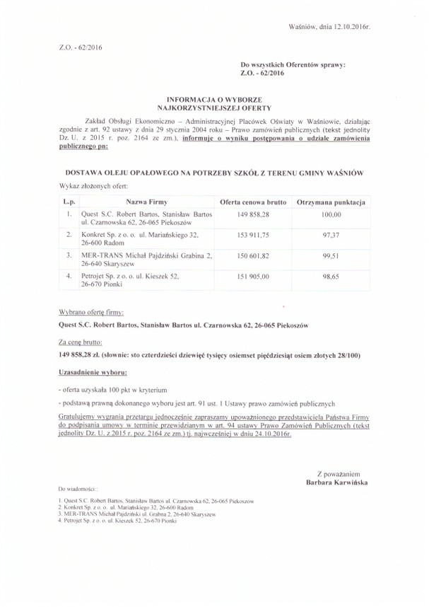 Zakład Obsługi Ekonomiczno – Administracyjnej Placówek Oświaty w Waśniowie, działając zgodnie z art. 92 ustawy z dnia 29 stycznia 2004 roku – Prawo zamówień publicznych (tekst jednolity Dz. U. z 2015 r. poz. 2164 ze zm.), informuje o wyniku postępowania o udziale zamówienia publicznego: