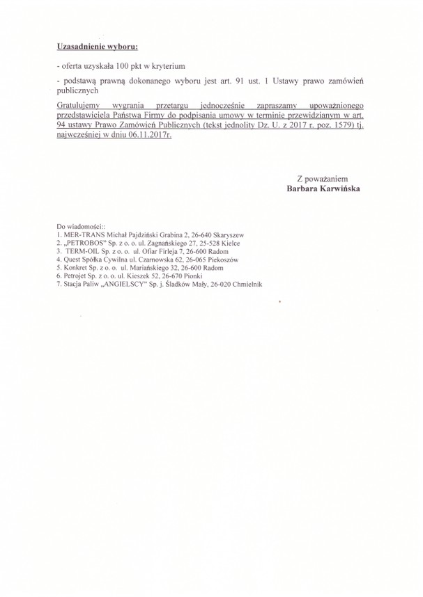 Centrum Usług Wspólnych w Waśniowie, działając zgodnie z art. 92 ustawy z dnia 29 stycznia 2004 roku – Prawo zamówień publicznych (tekst jednolity Dz. U. z 2017 r. poz. 1579), informuje o wyniku postępowania o udziale zamówienia publicznego pn:
