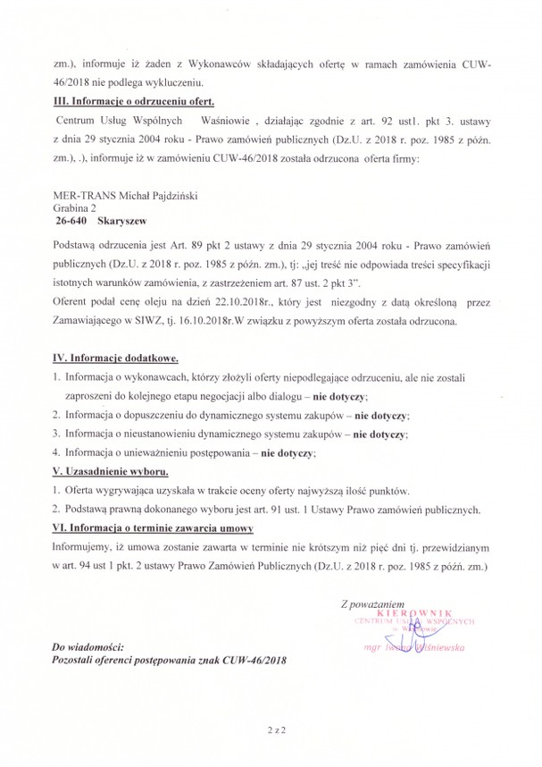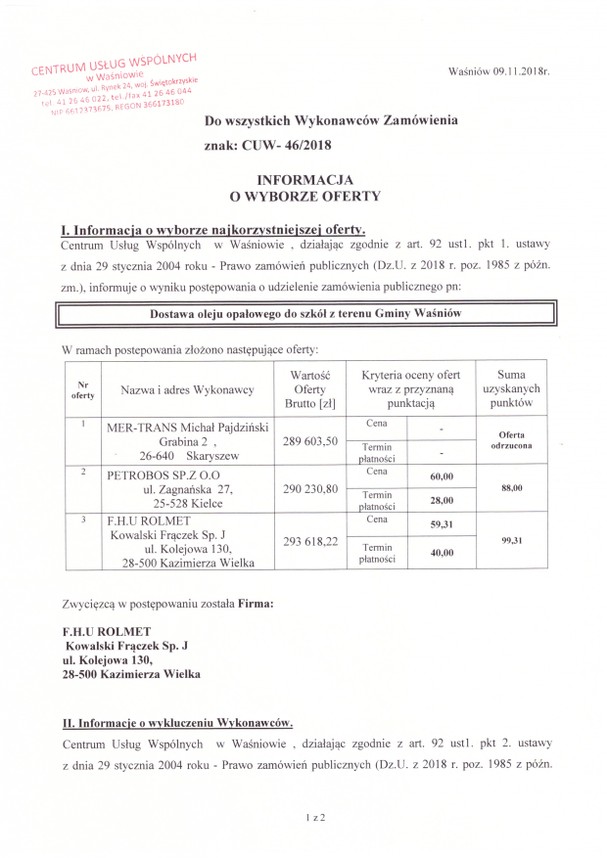 Informacja o wyborze oferty dot. CUW-46/2018 - Aktualności - Centrum Usług Wspólnych w Waśniowie
